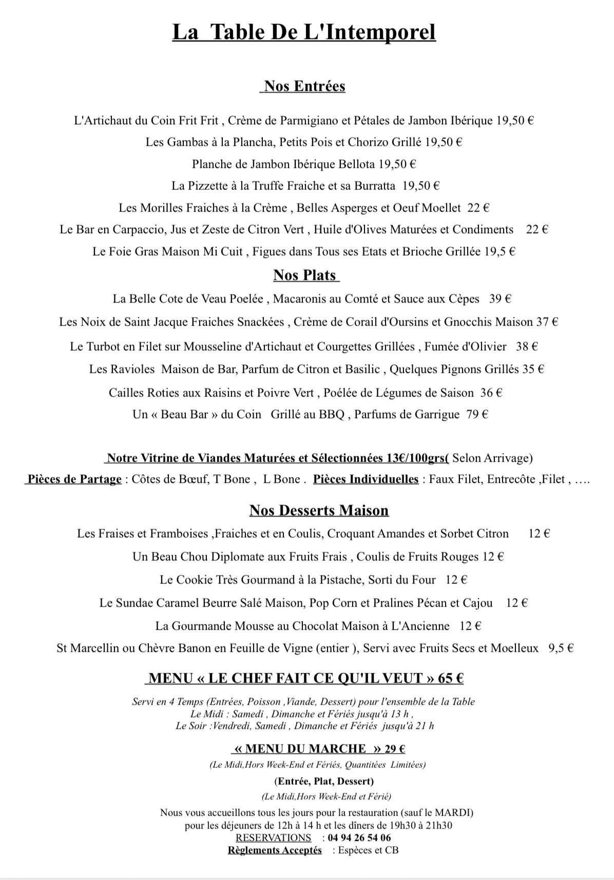 Nous proposons du lundi au vendredi un menu du marché (hors jours fériés )à 29€ainsi qu’une carte renouvelée au gré des produits et des saisons.